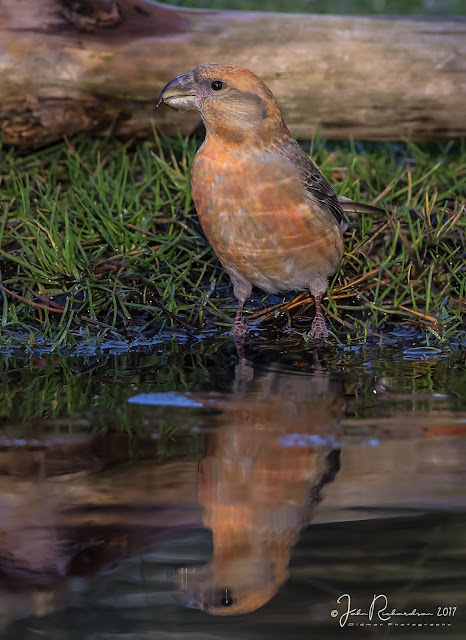Then I heard a sound that I recognised, then flying over my head flew 6 Crossbill's, which dropped into a fir tree close to a puddle, so I crept under the surrounding tree, to take some photos, that's when I noticed that the were not Common Crossbill's, but Parrot Crossbill's much rarer